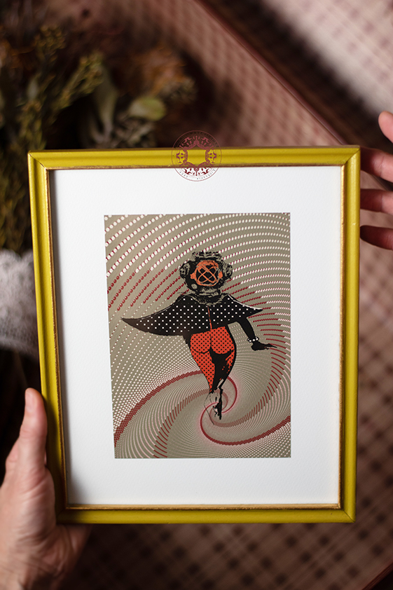 Hand-drawn diving helmet illustration print: ”Disco”, 2021, by Rasa Mateviciute.