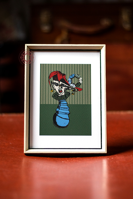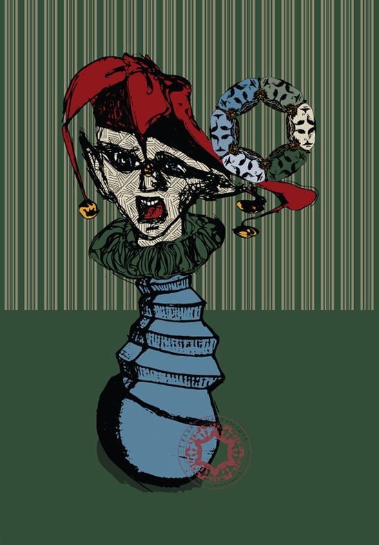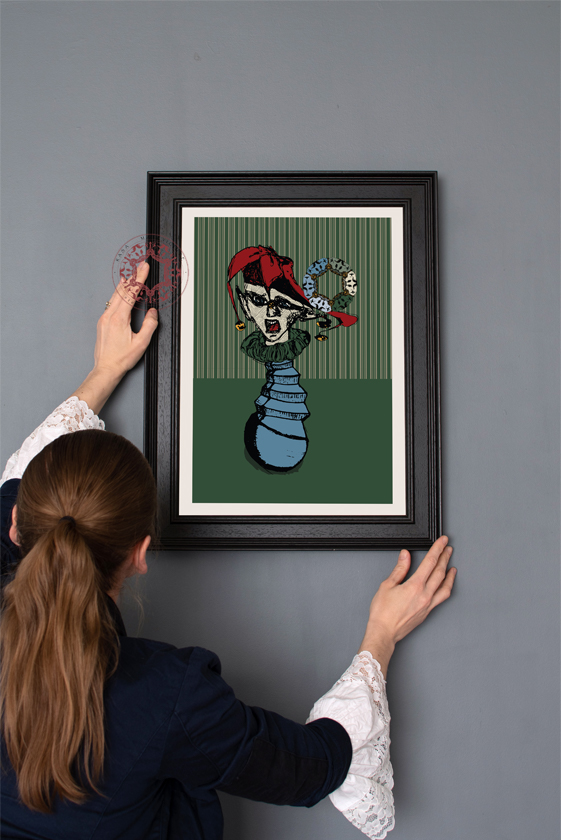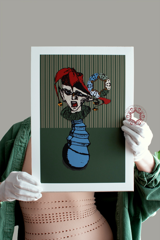 Hand-drawn joker illustration print – ”Joke Balance” 2021, by Rasa Mateviciute.